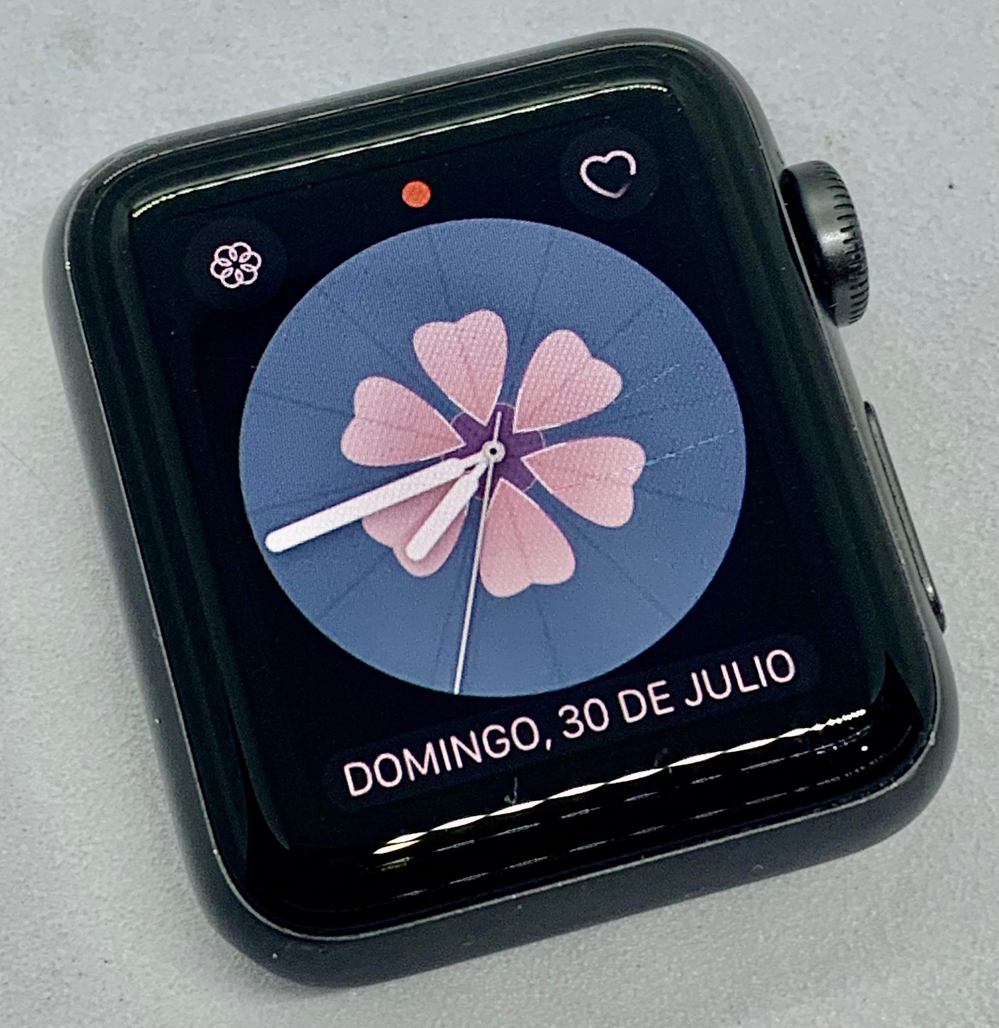 Este Apple Watch series 3 de 38 MM color space gray viene con una pantalla de 272 x 340, una batería con iones de litio con duración de hasta 18 horas, un chip S3 SiP con procesador de doble núcleo y GPS. Las funciones incluidas son resistencia al agua, GymKit, sensor cardiaco óptico y un giroscopio. Incluye accesorios genéricos como correa base negra + correa extra y cargador. No viene con caja. Porcentaje de batería al 89%. La pantalla tiene dos líneas diminutas que se pueden ver a simple vista mas disminuyen al encender el reloj, hay ligero desgaste en el exterior del reloj. El funcionamiento excelente. |