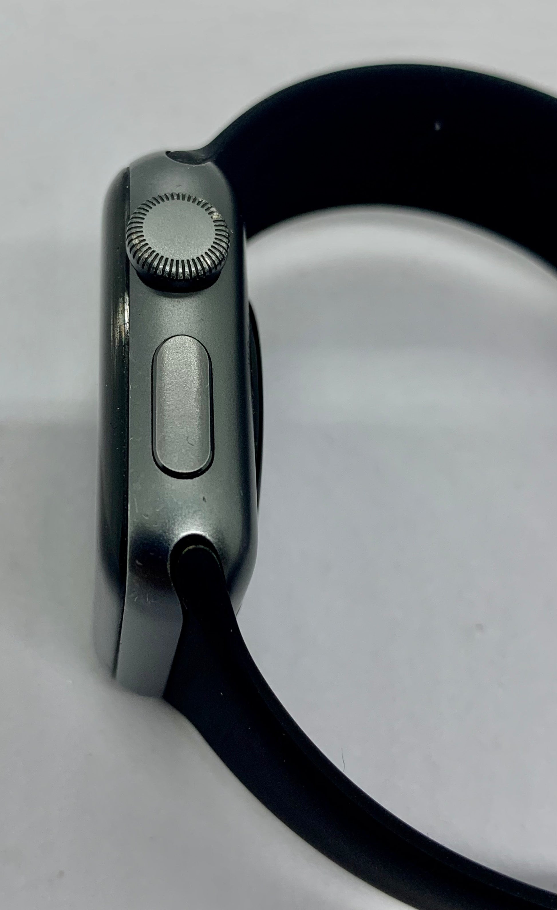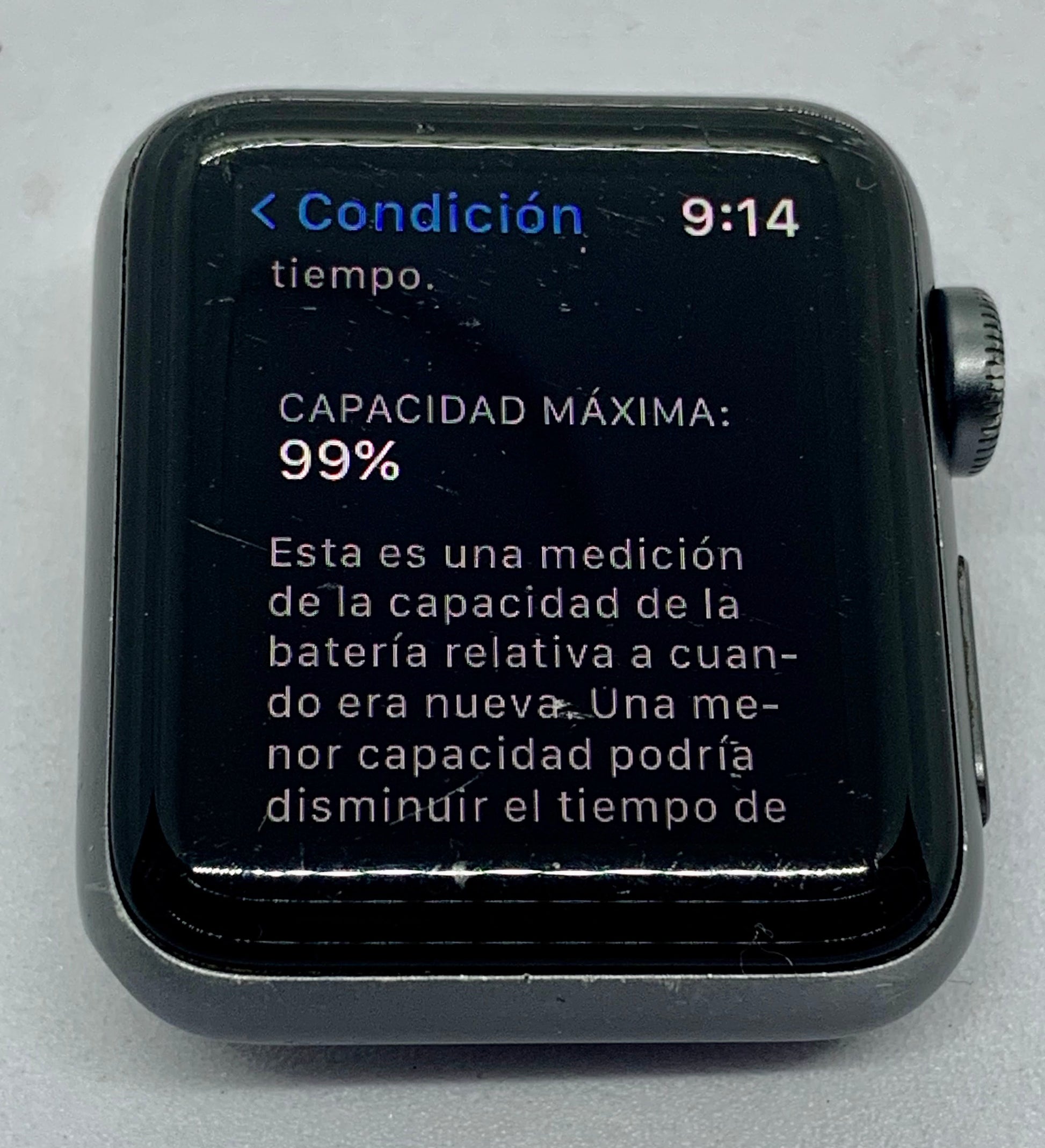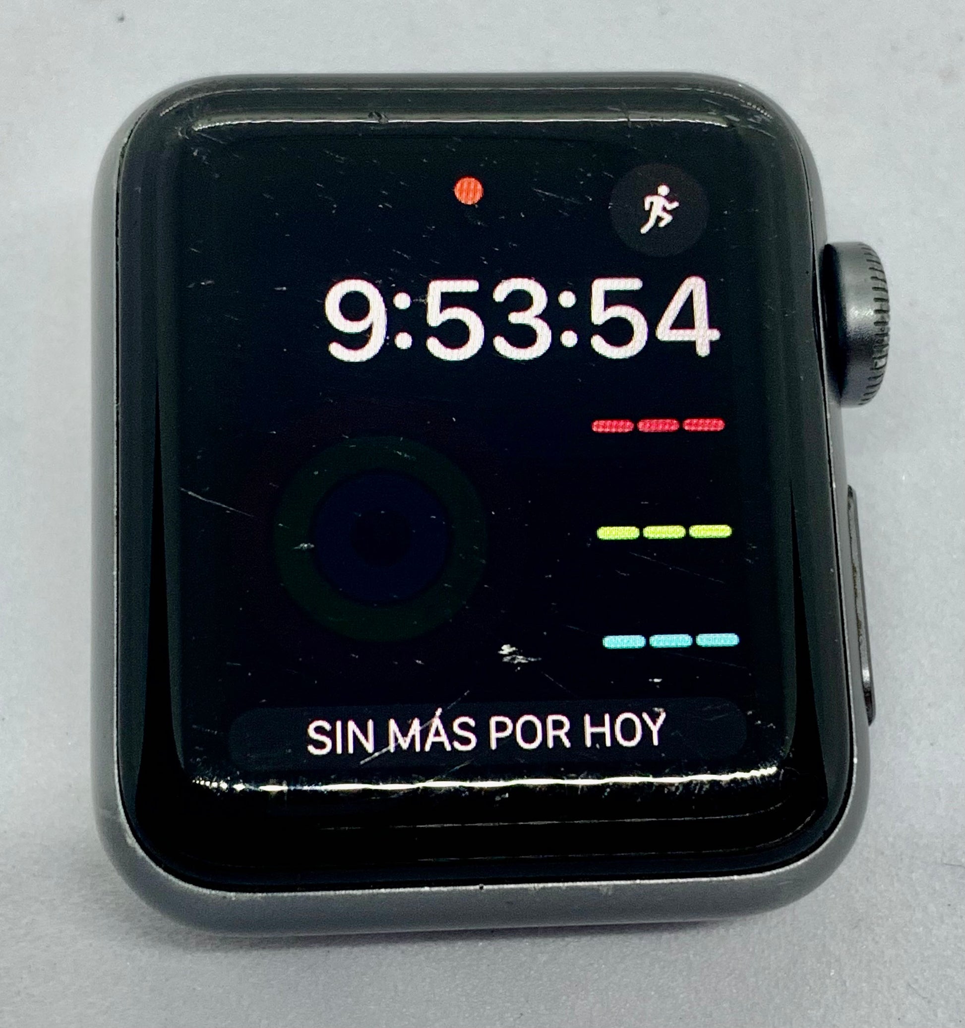 Este Apple Watch series 3 de 38 MM color space gray viene con una pantalla de 272 x 340, una batería con iones de litio con duración de hasta 18 horas, un chip S3 SiP con procesador de doble núcleo y GPS. Algunas funciones incluidas son resistencia al agua, GymKit, sensor cardiaco óptico y un altímetro. Incluye accesorios genericos como correa base negra + correa extra y cargador. No viene con caja. Porcentaje de batería al 99%, En la pantalla se ven algunas marcas de desgaste, rayones ligeros que solo a contra luz se perciben. la pintura de la perilla se nota un poco desgastada. |
