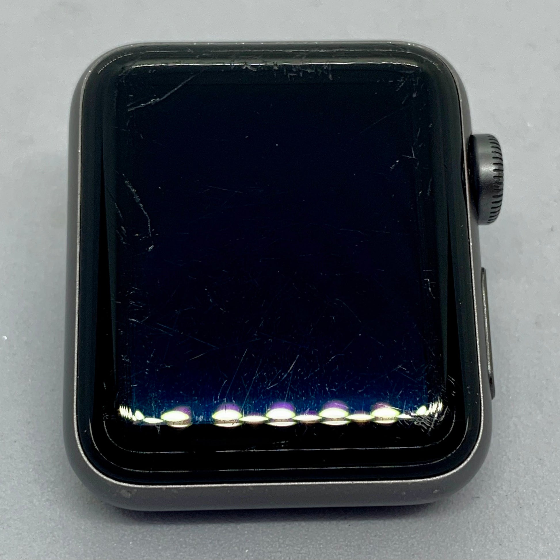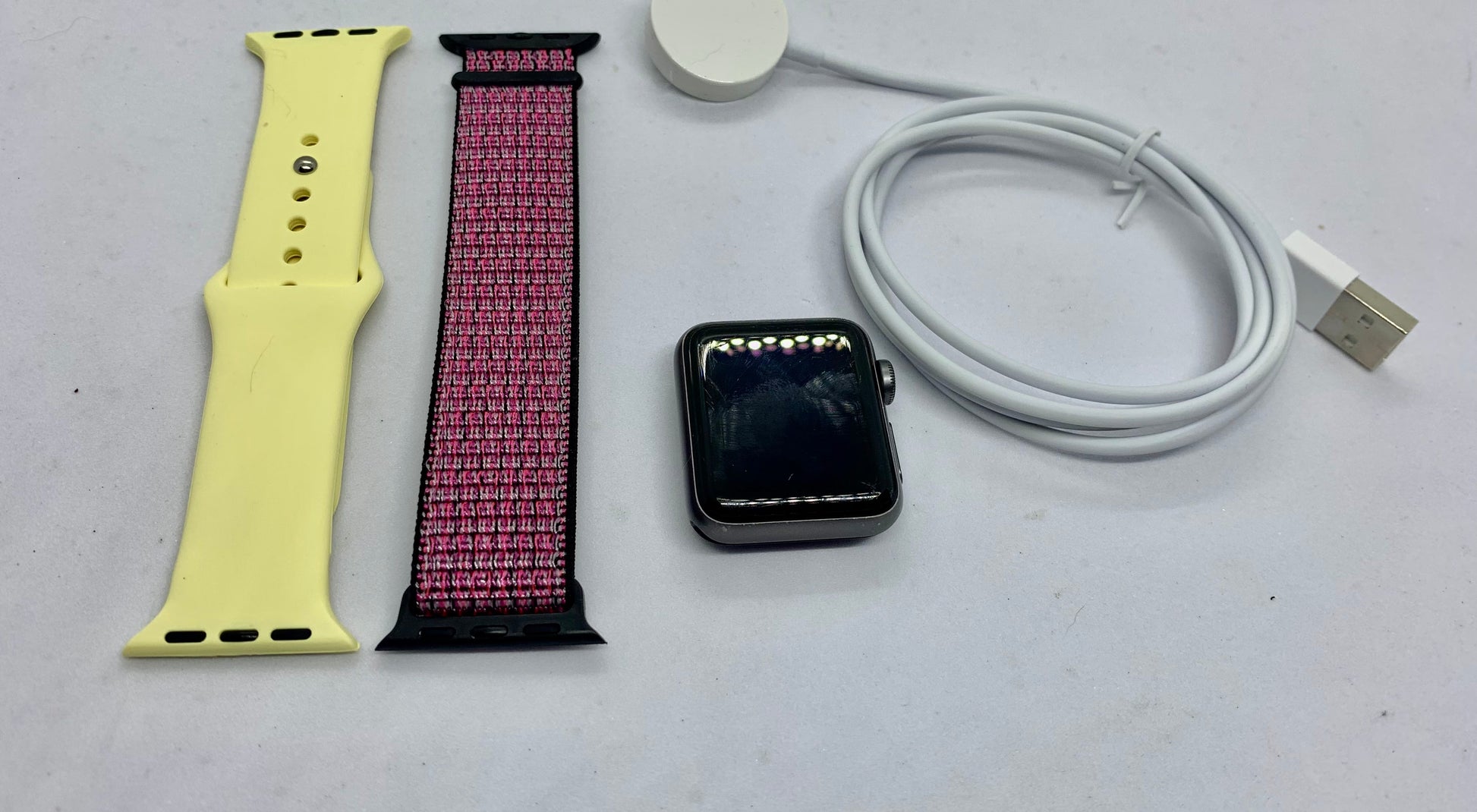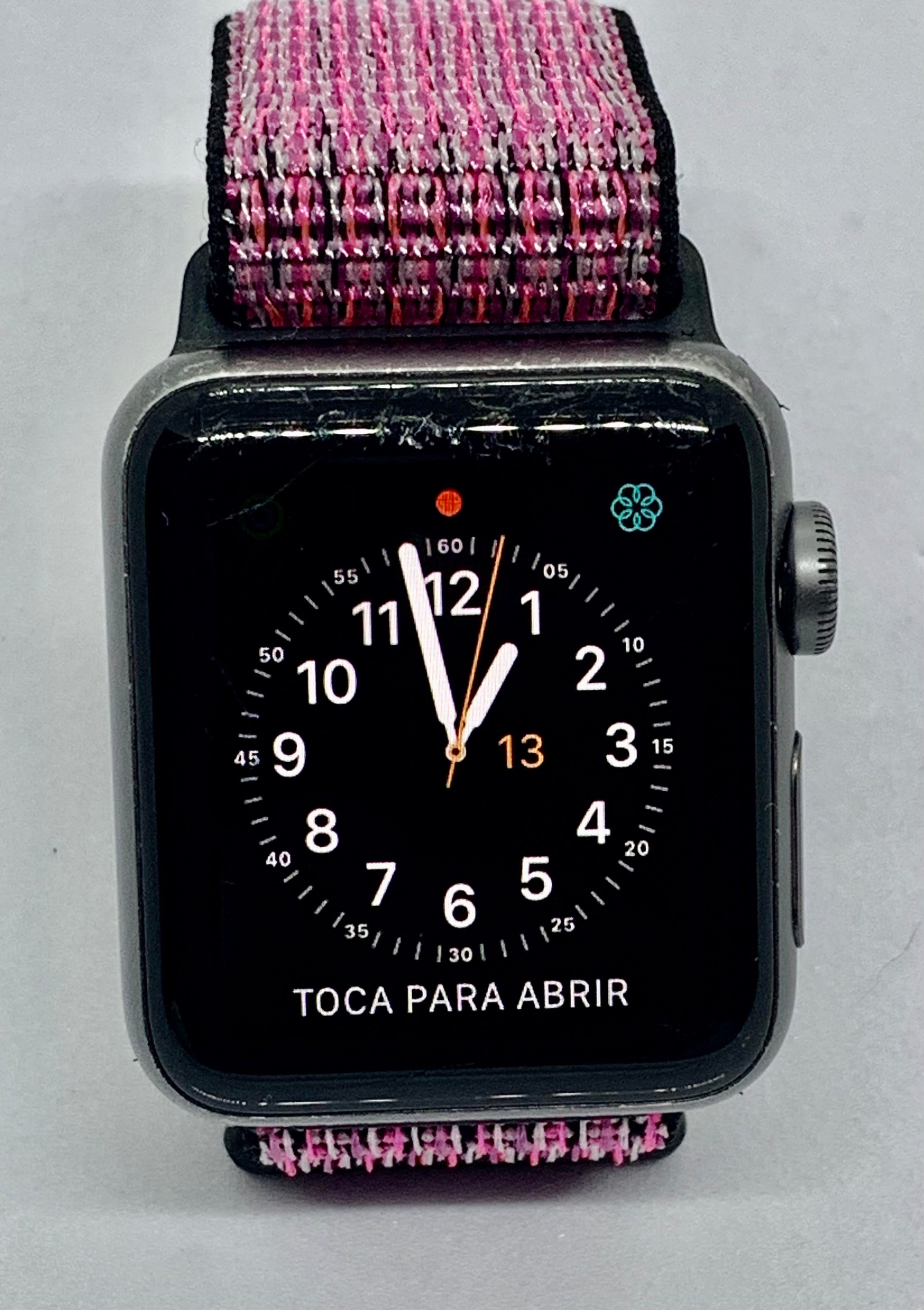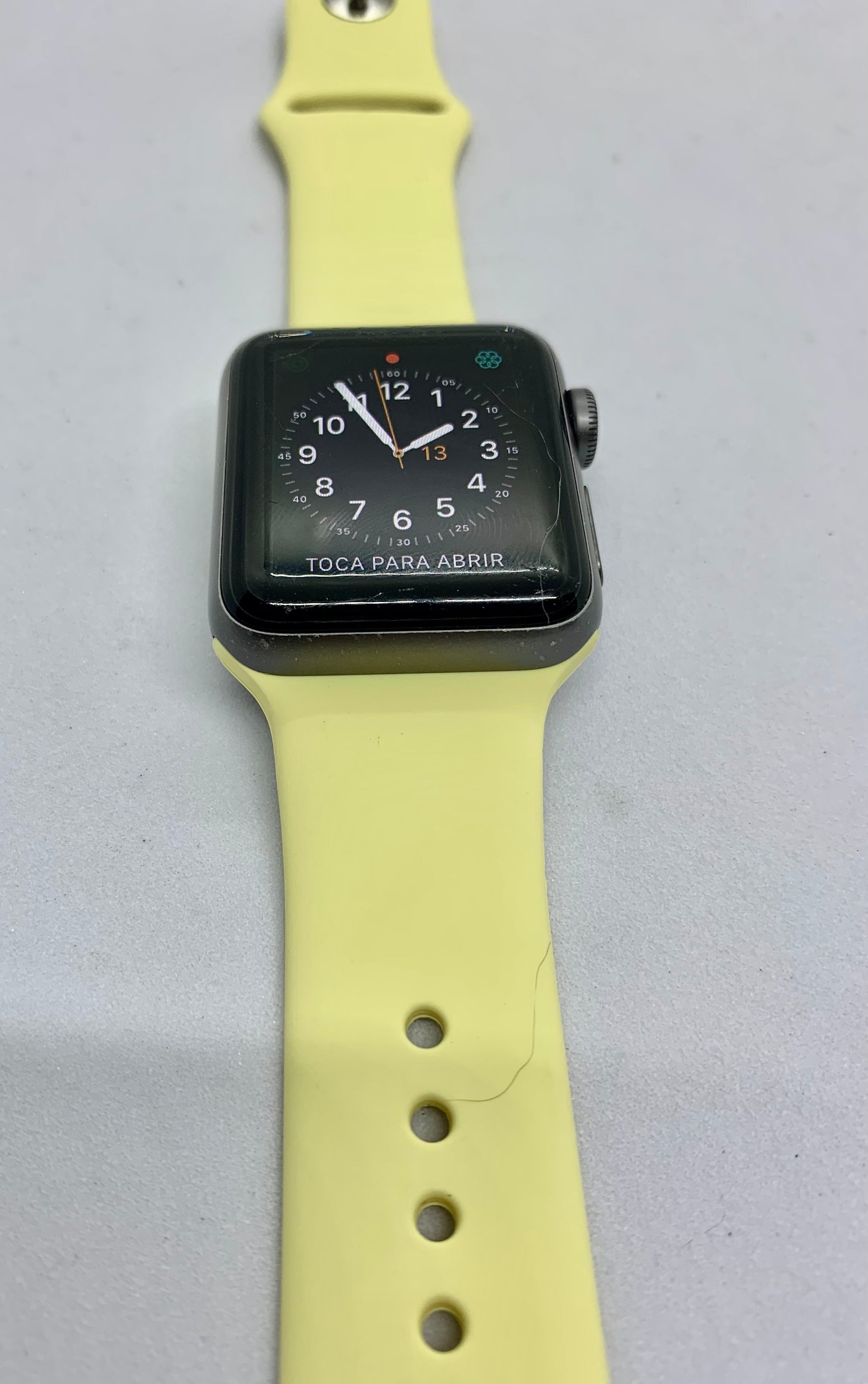 Este Apple Watch series 3 de 38 MM color space gray viene con una pantalla de 272 x 340 con una retina OLED, una batería con duración de hasta 18 horas, un chip S3 y GPS. Las funciones incluidas son algunas como un altímetro, un sensor cardiaco óptico, GymKit y resistencia al agua. Incluye accesorios genericos como correa base amarilla + correa extra y cargador. No viene con caja. Porcentaje de batería al 86%. En la pantalla se ven multiples rayones no profundos pero si visibles a simple vista, estos no afectan el funcionamiento del touch, el exterior muestra un poco dedesgaste en el esmalte de la carcasa y en el centro de carga. |