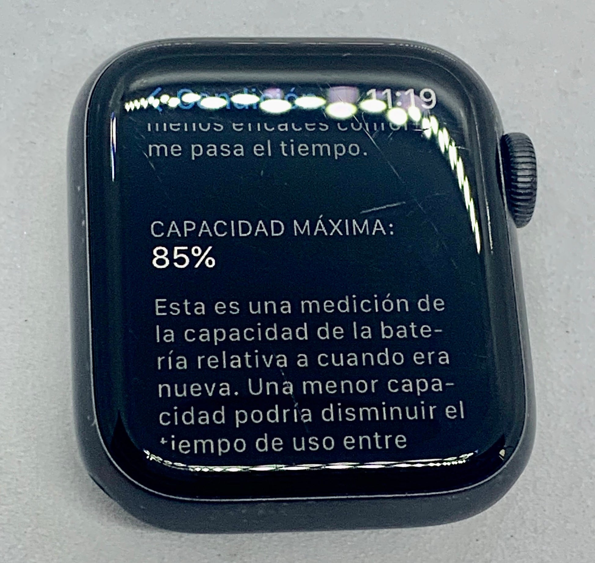 Este Apple Watch series 5 color space gray, viene con una pantalla de 368 x 448 pixeles, una batería con iones de litio con duración de hasta 18 horas, un chip S5 con procesador de doble núcleo, GPS. Algunas funciones son un acelerómetro, resistencia al agua, sensor eléctrico de frecuencia cardiaca y un altímetro barométrico. Incluye dos correas en colores llamativos y cargador. A simple vista en la pantalla se pueden ver algunas marcas, una de ellas es sensible al tacto, sin embargo el funcionamiento del touch no se ve afectado, en los laterales se ve algo de desgaste en la pintura. La batería esta al 85%. |