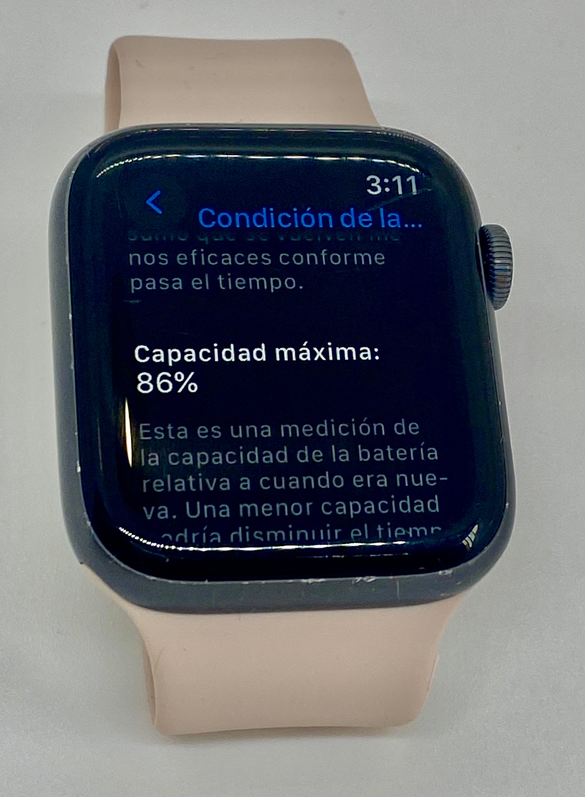Este Apple Watch series 5 de 44 MM color Space Gray, viene con una batería con hasta 18 horas de duración, un chip S5 con procesador de 64 bits, GPS y bluetooth. Algunas de las funciones son un sensor de luz ambiental, un sensor cardiaco electrico y resistencia al agua. Incluye 2 correas genericas y cargador original. La pantalla tiene una raya en la esquina, no es profunda pero si visible si le pones atencion, esto no afecta el rendimiento de la misma. En el exterior hay un poco de desgaste del esmalte. Se probaron algunas funciones como la recepcion de mensajes, el sonido, etc. y su funcionamiento es perfecto. La bateria se encuentra al 86%